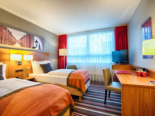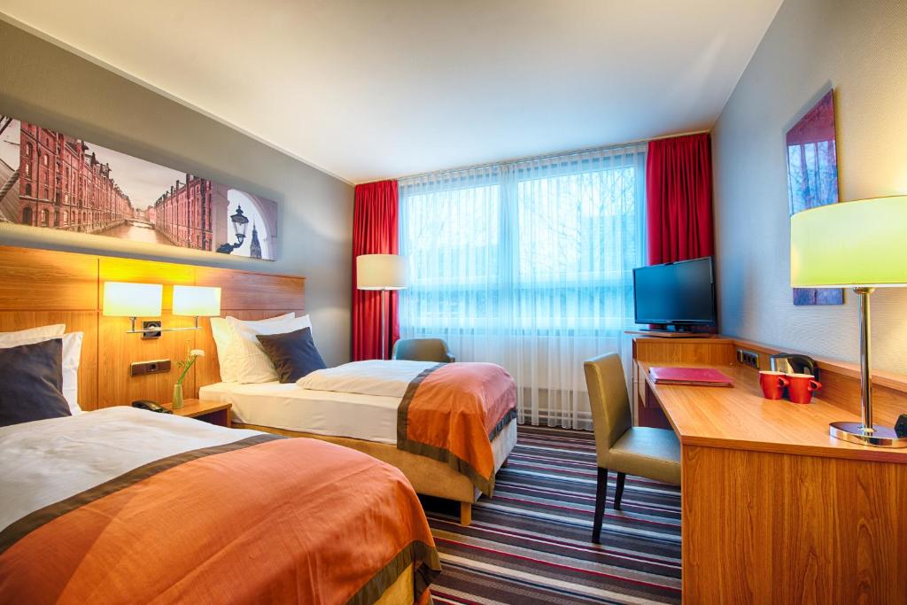 Die modernen Zimmer im Leonardo Hotel Hamburg City Nord verfügen über einen 32-Zoll-Flachbild-TV, kostenlose Sky-Sat-Kanäle, Verdunkelungsvorhänge und einen Schreibtisch.