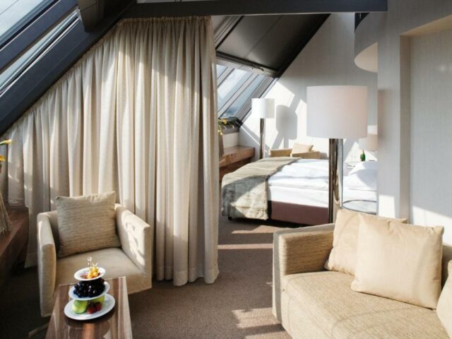 Das 4-Sterne-Superior-Hotel Mövenpick Hamburg bietet schallisolierte Zimmer mit einer Einrichtung aus dunklem Holz, extra langen Betten und modernen Bädern.